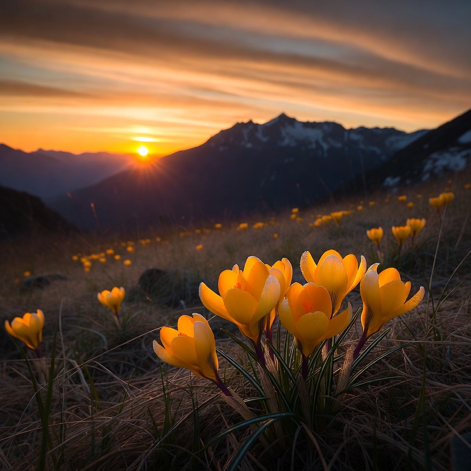 alpine, bloom, clouds, crocuses, flowers, golden hour, grass, landscape, meadow, mountain, nature, orange sky, outdoors, purple sky, sky, snow-capped mountains, spring flowers, sun, sunrise, sunset, yellow flowers, crocus