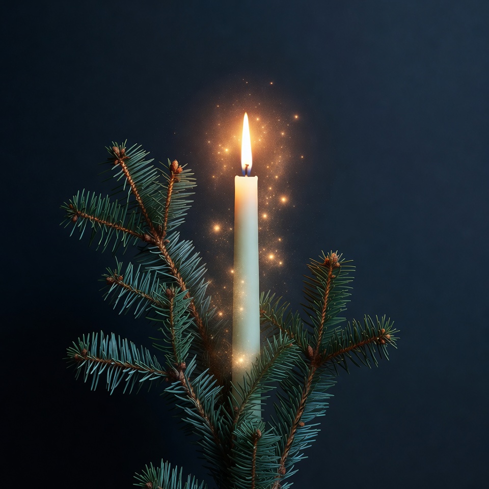 A tall white candle with a bright glowing flame is surrounded by fresh green fir branches on a dark background. Golden sparkles emanate from the flame, adding a magical festive glow. The branches frame the candle elegantly.