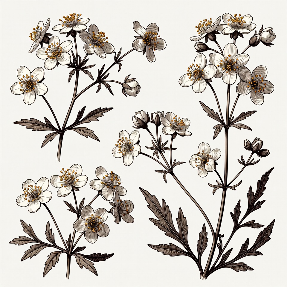 botany, bouquet elements, buds, clipart, drawing, feathery leaves, floral design, flower clusters, flower illustration, hand drawn, isolated background, leaves, line art, multiple flowers, nature art, plants, sketch, stems, vector flowers, white flowers, yellow centers, anemone flowers