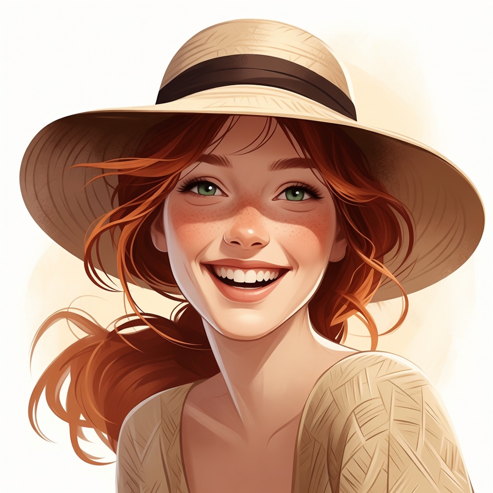 White, artistic rendering, beige top, black band, casual fashion, digital art, female, freckles, green eyes, happy face, illustration, isolated background, ponytail, portrait, red hair, smiling, straw hat, sun hat, vibrant hair, wide brim hat, young woman, woman