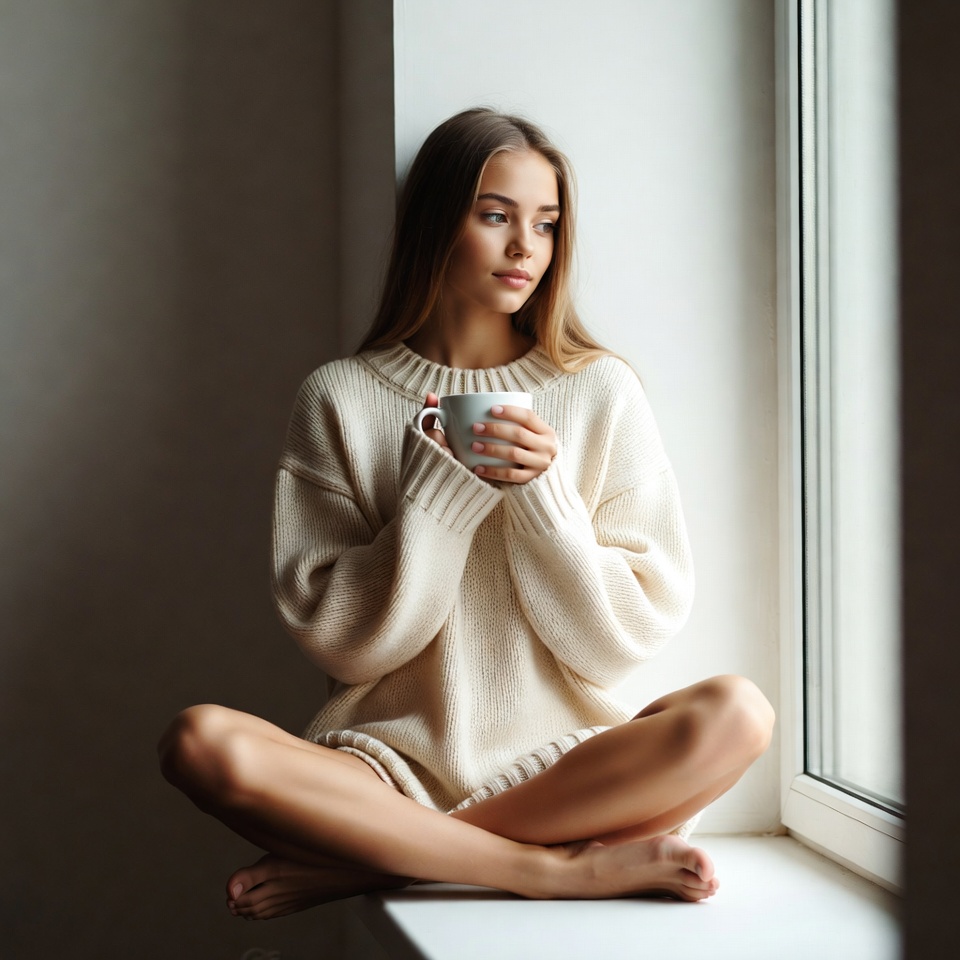 A young woman with long brown hair sits cross-legged on a windowsill, holding a white mug with both hands. She wears a cozy white oversized sweater and gazes thoughtfully out the large window. Her bare legs and feet are visible as she relaxes in the bright, minimalist room.