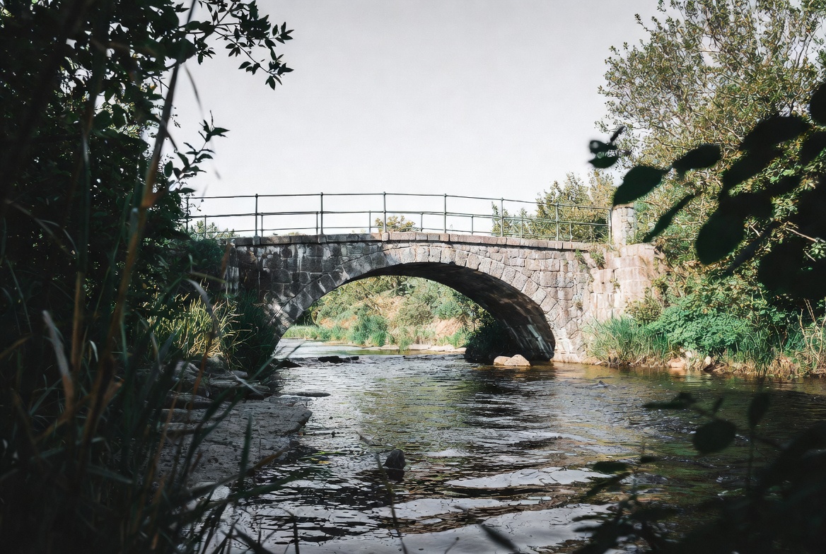 arch bridge, branches, bridge over river, calm water, environment, foliage, footbridge, greenery, landscape, natural, nature, outdoors, pathway, railings, reeds, river, rocks, rustic, scenery, serene, stream, sunlight, trees, vegetation, water, stone bridge