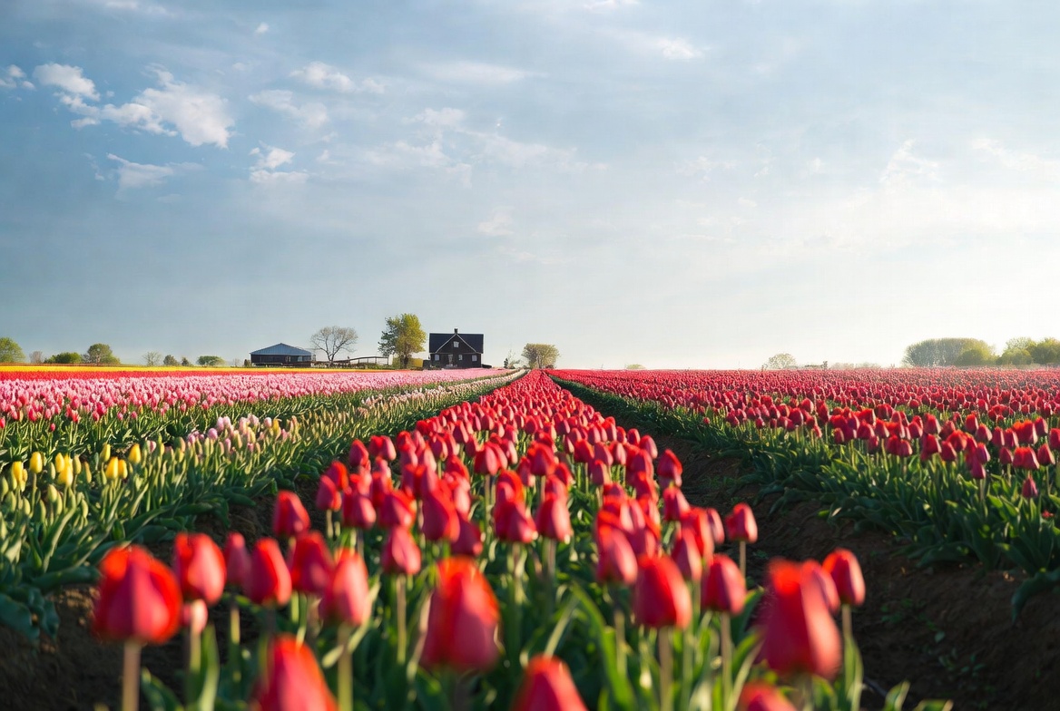 Vibrant rows of red tulips stretch across a vast field under a partly cloudy blue sky. A dirt path runs through the center of the colorful tulip plantation, leading towards a distant dark barn flanked by trees. Yellow and purple tulips add variety to the dominant red blooms in the foreground.