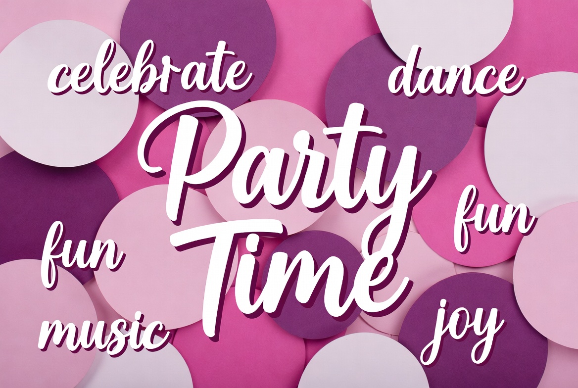 bold letters, celebrate, dance, festive text, fun, graphic design, illustration, joy, music, overlapping circles, paper cutouts, party invitation, pink background, pink circles, purple circles, vibrant background, white circles, party time
