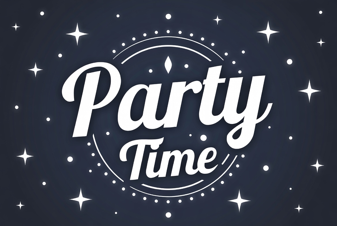 bold font, celebration graphic, clipart, dark background, digital art, event poster, festive design, fun text, graphic design, illustration, invitation design, navy background, party, party invitation, sparkling stars, stars, text, time, white text, party time