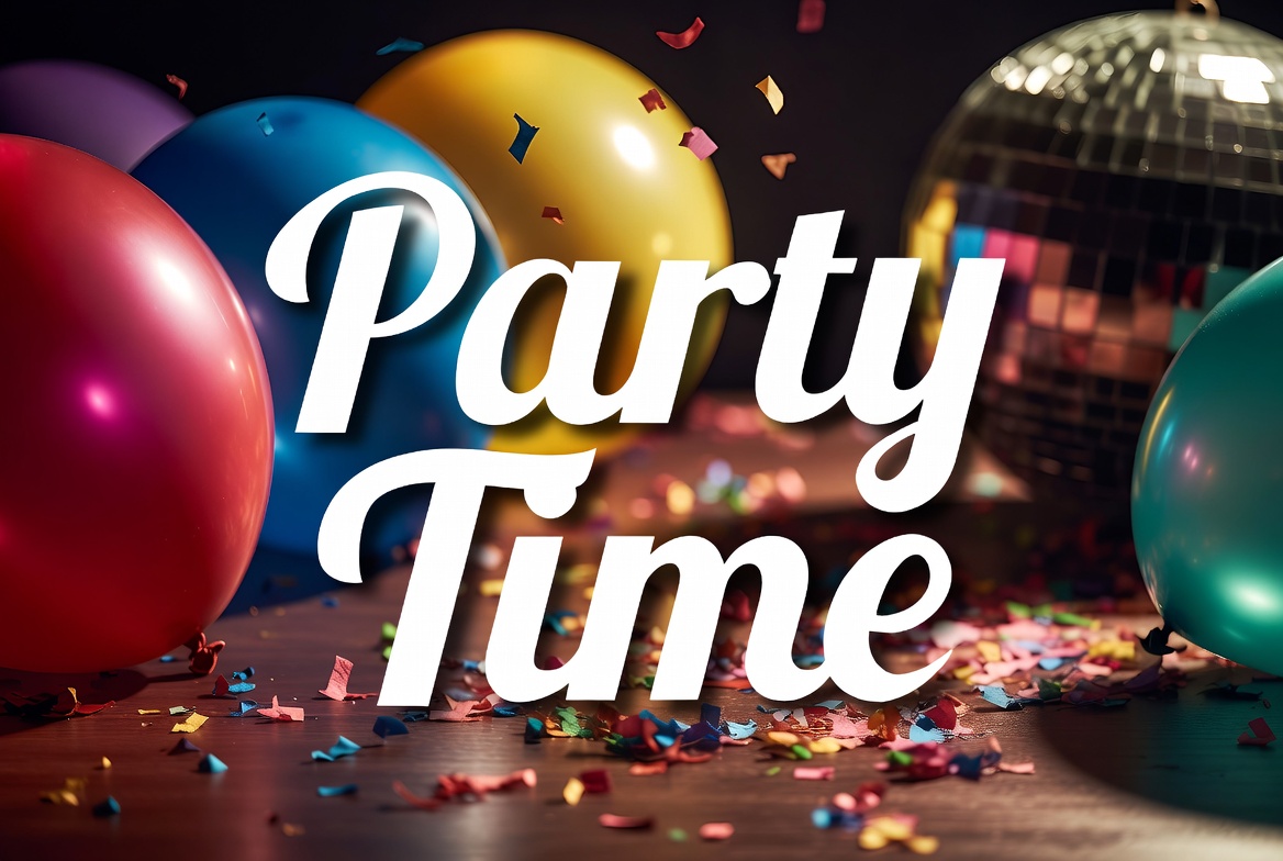 balloons, blue balloon, celebration, confetti, disco ball, festive, green balloon, illustration, isolated background, multicolored balloons, party, purple balloon, red balloon, script font, white text, wooden surface, yellow balloon, party time