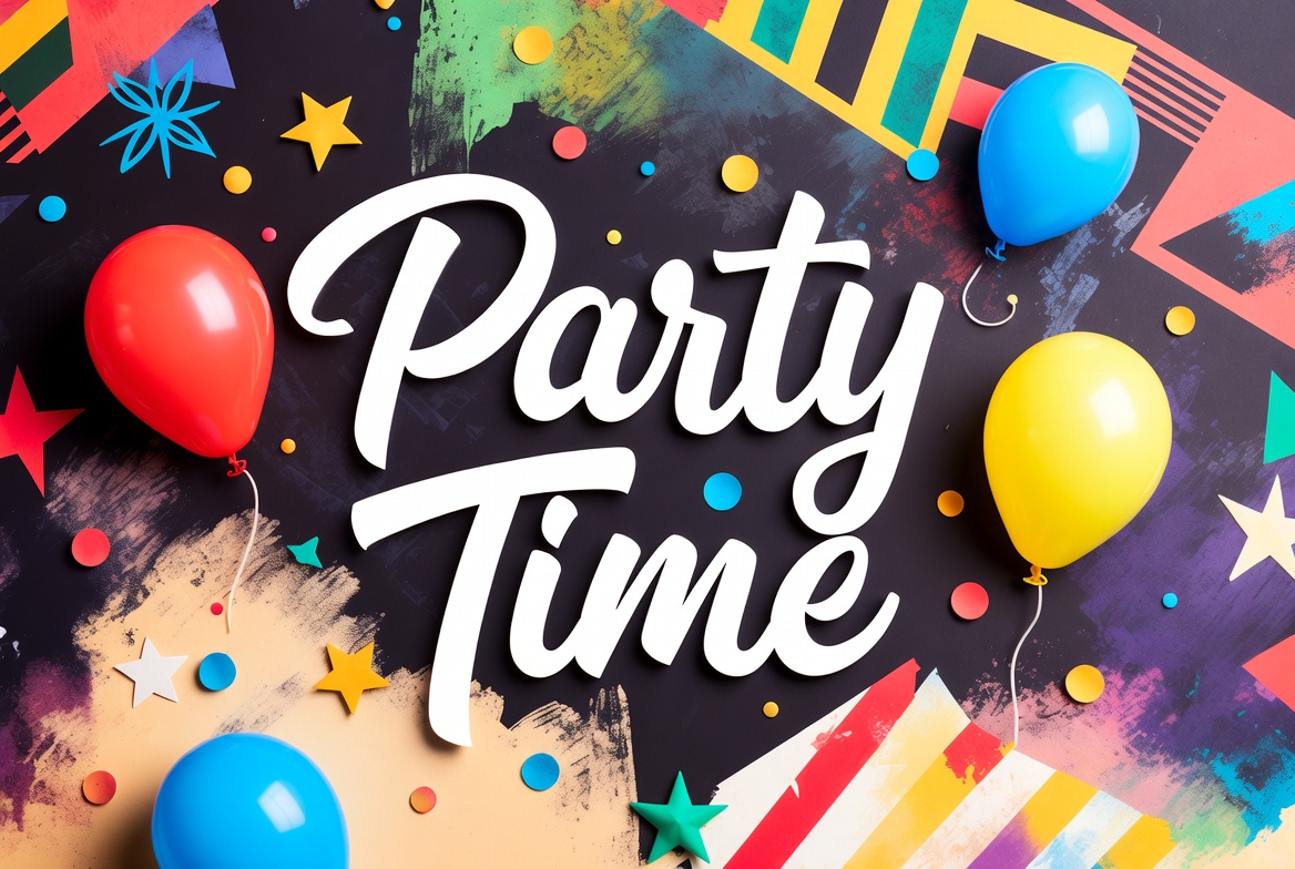 abstract design, balloons, banner, blue balloon, celebration, colorful background, confetti, festive, flat lay, fun, geometric shapes, graphic, holiday, illustration, invitation, isolated background, multicolored, party, red balloon, stars, vibrant, white text, yellow balloon, party time