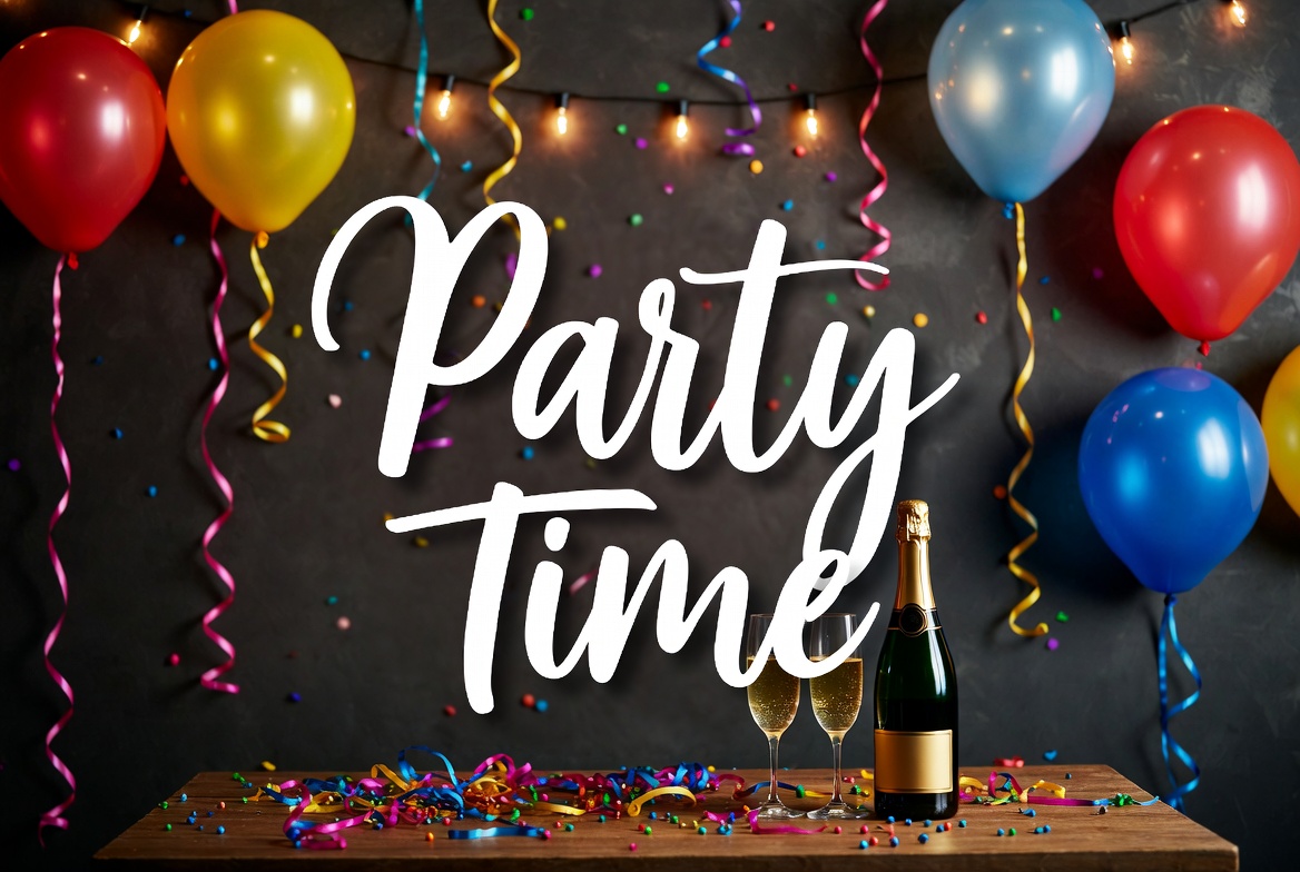 A festive scene features multicolored balloons and hanging streamers against a dark background. White cursive text reads 'Party Time' prominently. A wooden table displays a champagne bottle, two glasses, and scattered confetti.