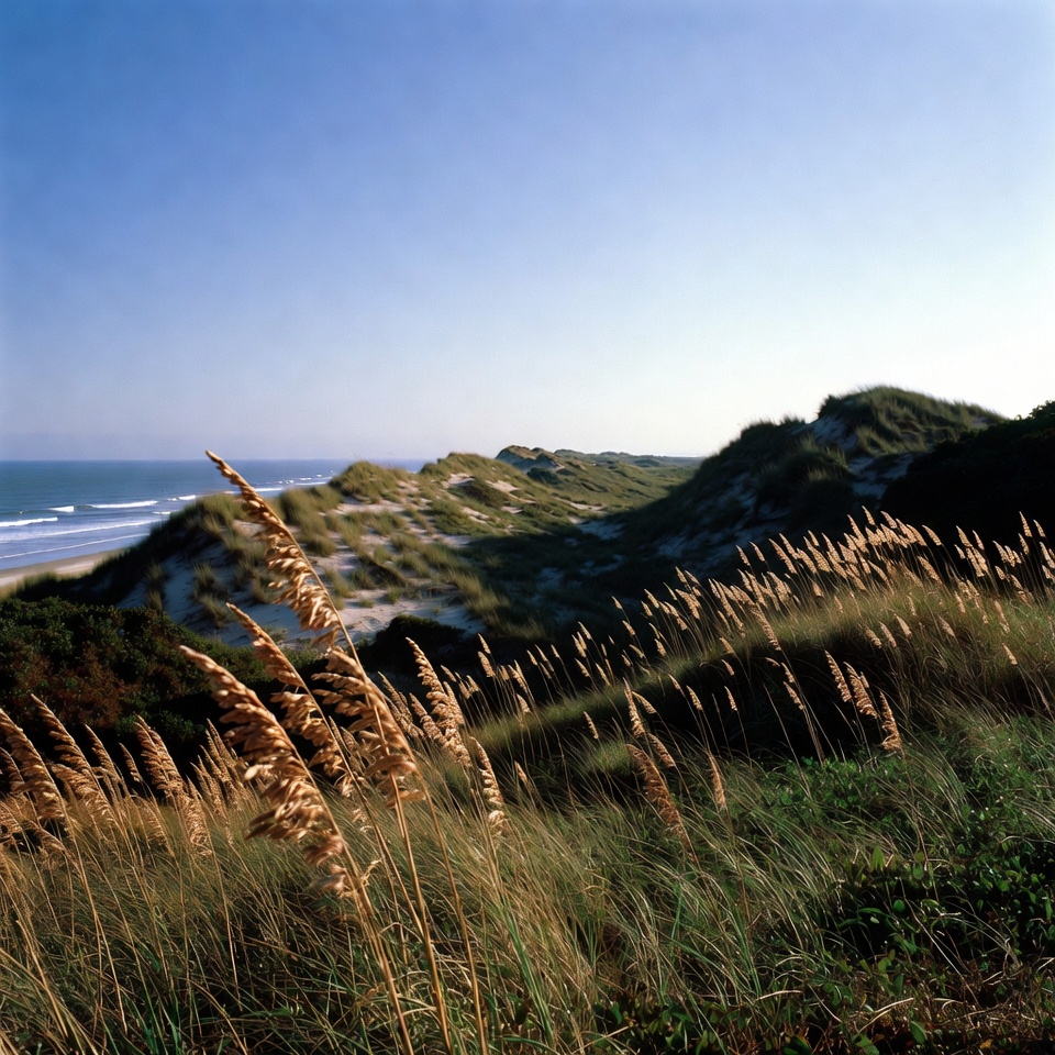 beach grass, blue sky, coastal landscape, dune grass, golden grass, grass foreground, nature scenery, ocean waves, rolling dunes, sand dunes, sand hills, sea grass, seaside dunes, sunny beach, beach dunes