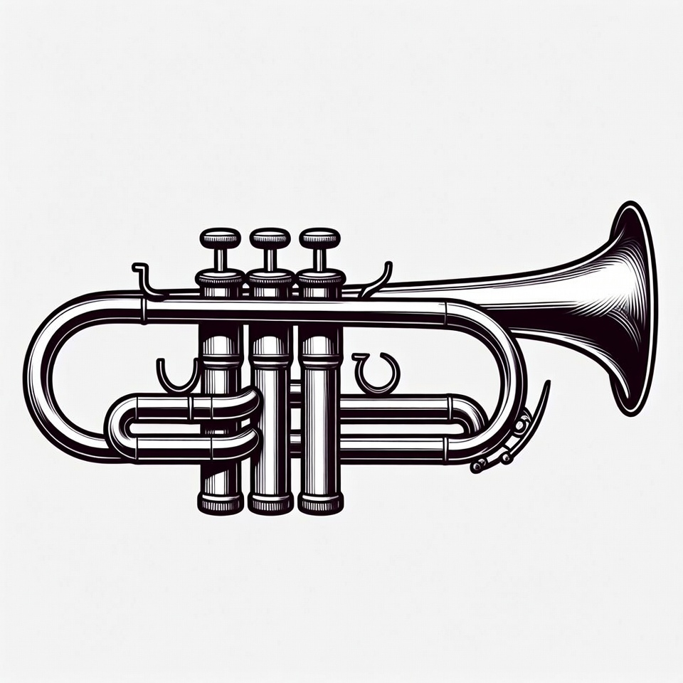 black and white, brass instrument, clipart, drawing, engraving style, horn instrument, illustration, isolated background, line art, musical brass, musical instrument, shiny trumpet, trumpet valves, vector art, trumpet