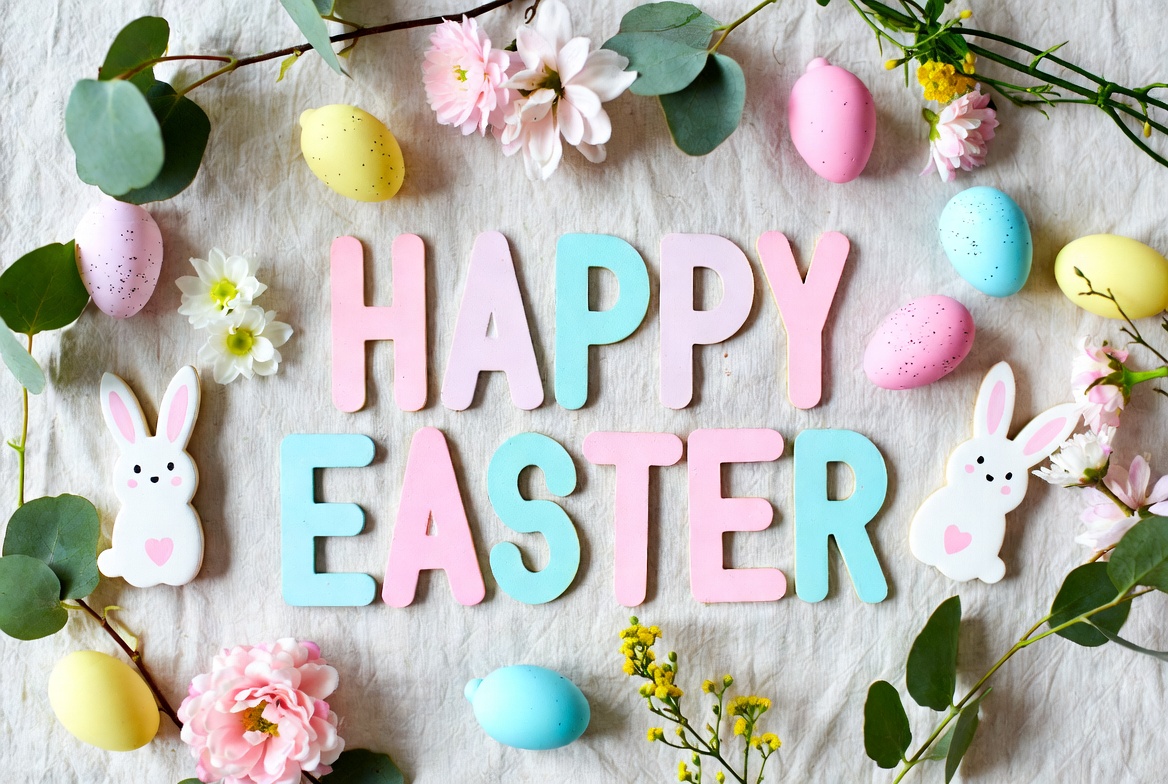 Easter, arrangement, blue eggs, bunny, celebration, cute bunny, daisies, eggs, eucalyptus, festive, flat lay, flowers, holiday, isolated background, pastel colors, pastel eggs, peonies, pink eggs, spring, white bunny, white fabric, wooden letters, yellow eggs, Happy Easter