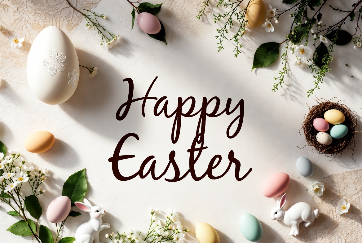 A festive flat lay features colorful Easter eggs in pastel shades scattered around green leaves and flowers. White toy bunnies sit among the eggs, with a small nest of speckled eggs nearby. Bold cursive text 'Happy Easter' is centered on a white background with lace details.