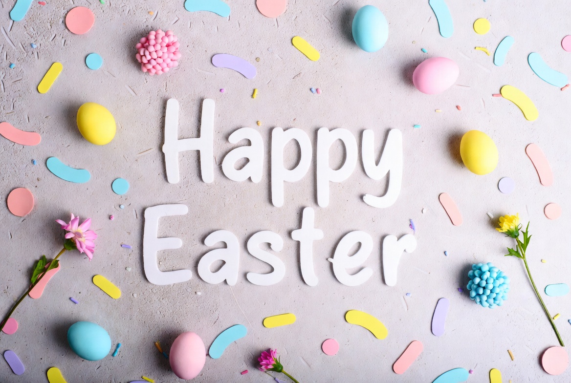 Easter, Easter eggs, blue egg, celebration, colored eggs, confetti, eggs, festive, flat lay, gray background, holiday greeting, isolated background, no people, paper cutouts, pastel colors, pastel eggs, pink egg, pink flowers, pom poms, spring, white egg, white letters, yellow egg, yellow flowers, Happy Easter