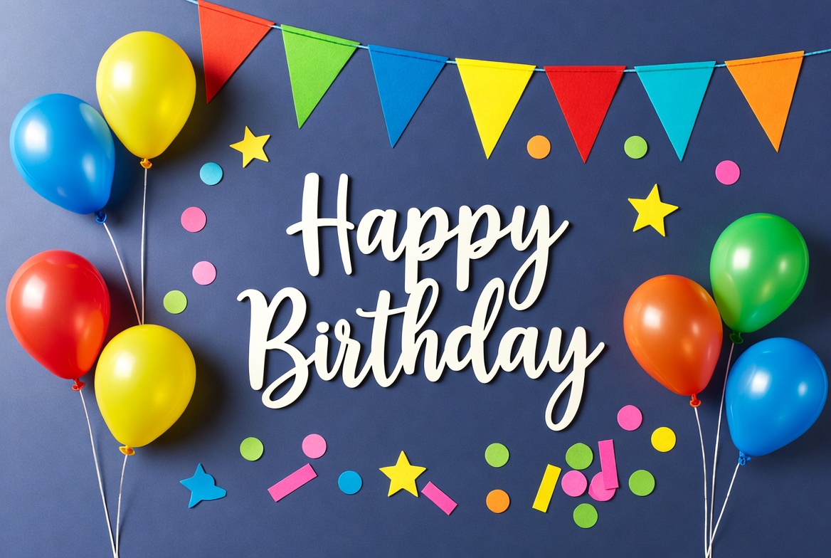 A vibrant flat lay features colorful balloons in red, yellow, blue, green, and orange clustered around white 'Happy Birthday' text on a dark blue background. Triangular bunting flags in matching colors hang above, with scattered stars, confetti, and small decorative elements adding festivity. The composition is playful and celebratory with no people present.