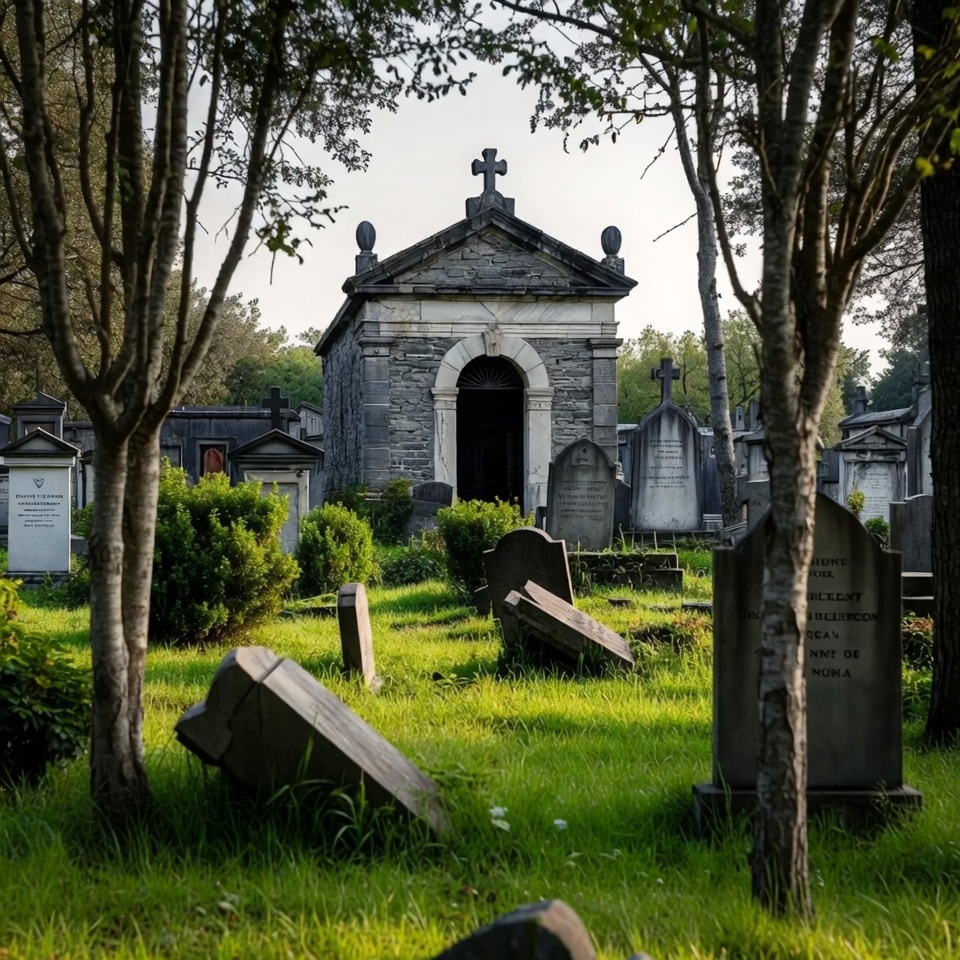 arched entrance, bushes, cemetery path, chapel, cross, gothic architecture, grass, gravestones, graveyard, headstones, landscape, mausoleum, memorial, outdoor, overgrown graves, serene, stone building, tombs, trees, cemetery