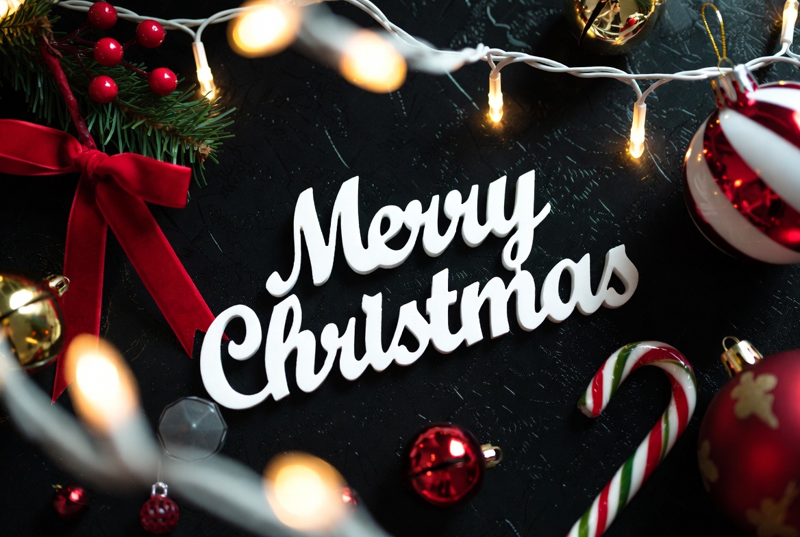 A festive flatlay features large white 'Merry Christmas' letters on a black background. Surrounding decorations include red ribbons, gold and red Christmas ornaments, holly branches, candy canes, and twinkling string lights. The composition is vibrant and holiday-themed with warm lighting accents.