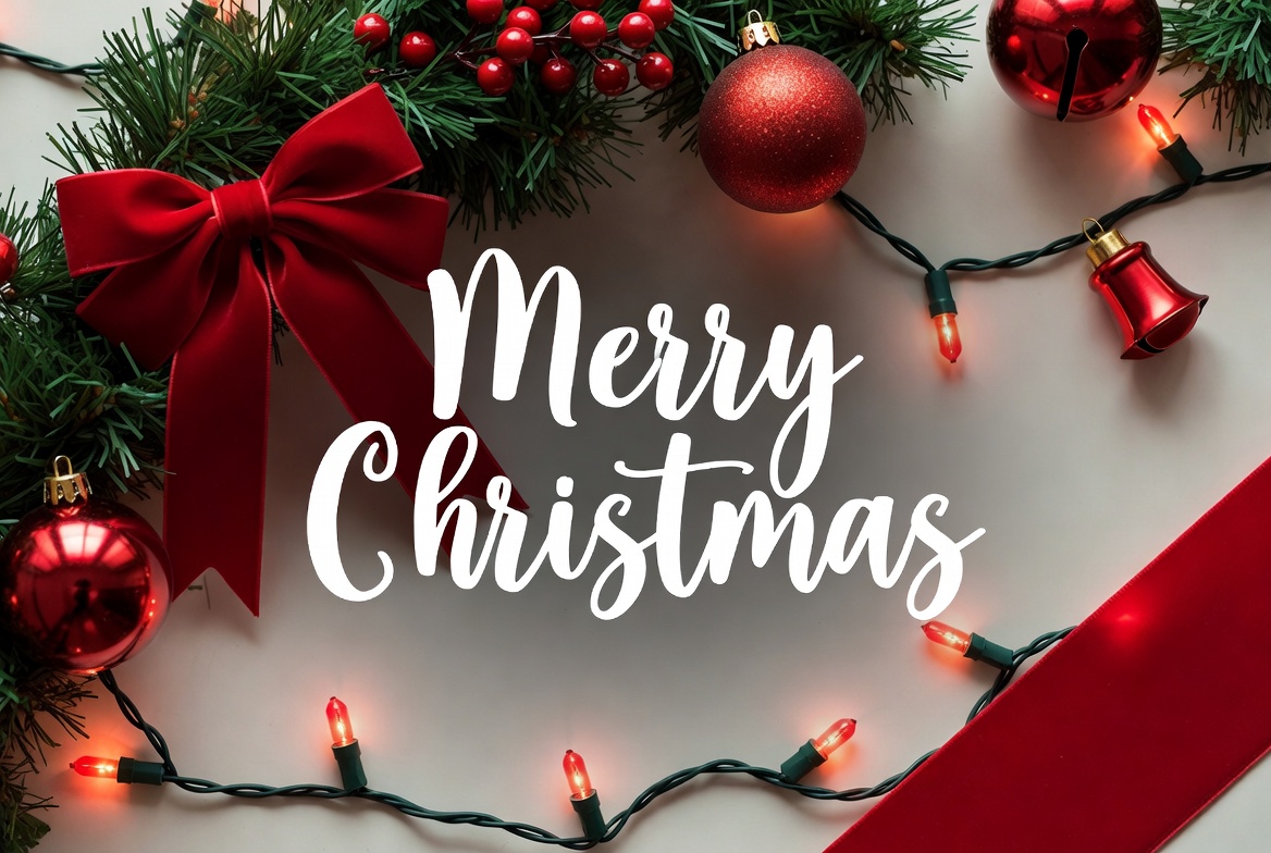 A festive flat lay features 'Merry Christmas' text in elegant white script centered on a white background. Surrounding it are green pine branches, red ribbons, shiny red Christmas balls, and glowing string lights. Red berries and bells add vibrant holiday accents.