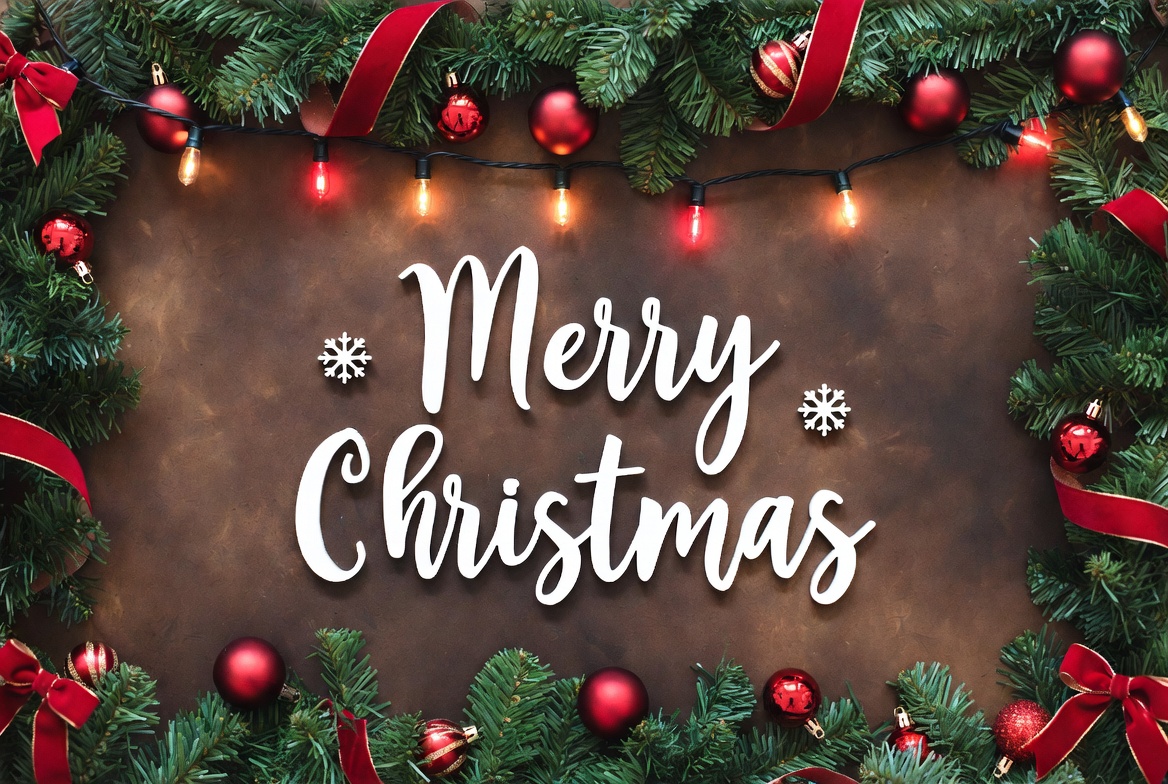 Christmas decorations, Christmas frame, Christmas greeting, Christmas ornaments, Christmas text, clipart style, evergreen branches, festive design, fir branches, glowing lights, green pine, holiday border, holiday wreath, isolated background, red baubles, red bows, red ribbons, snowflakes, string lights, white lettering, wooden background, Merry Christmas