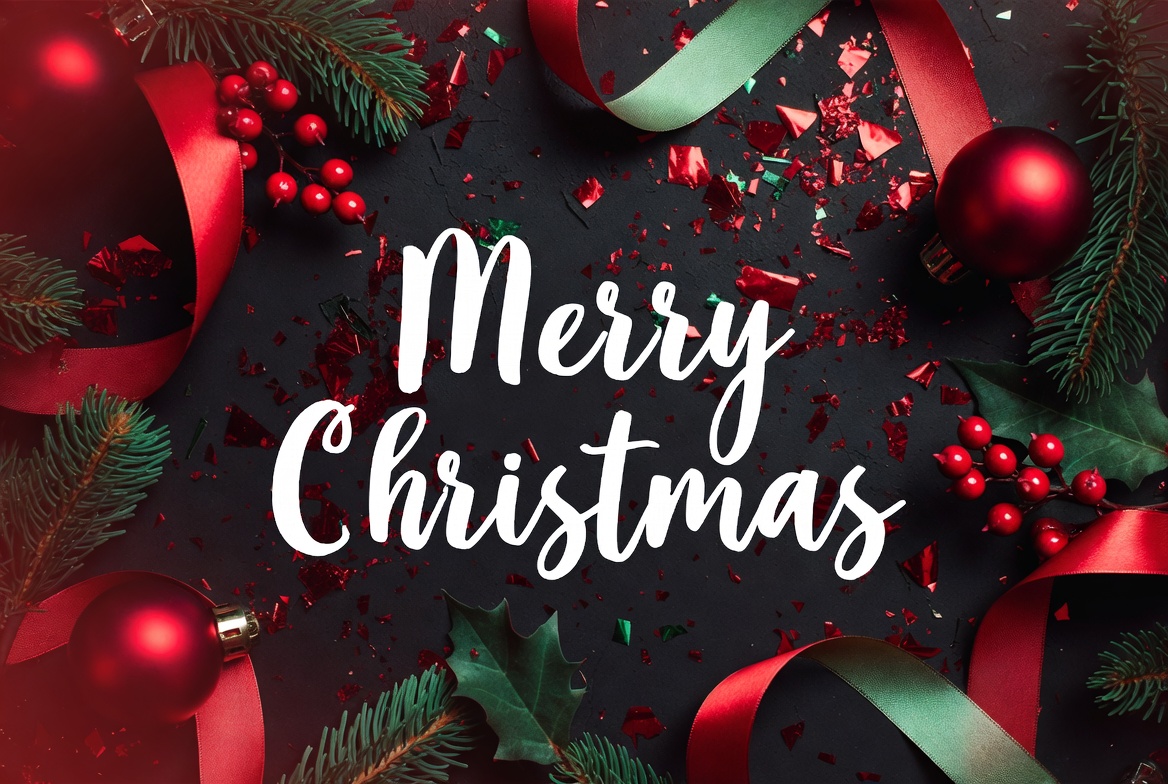 Christmas balls, Christmas design, Christmas greeting, Christmas ornaments, Christmas wreath elements, black background, festive decorations, fir branches, flat lay, glitter confetti, green ribbons, holiday border, holiday card, holly berries, red berries, red ribbons, seasonal greeting, white text, winter holiday, Merry Christmas