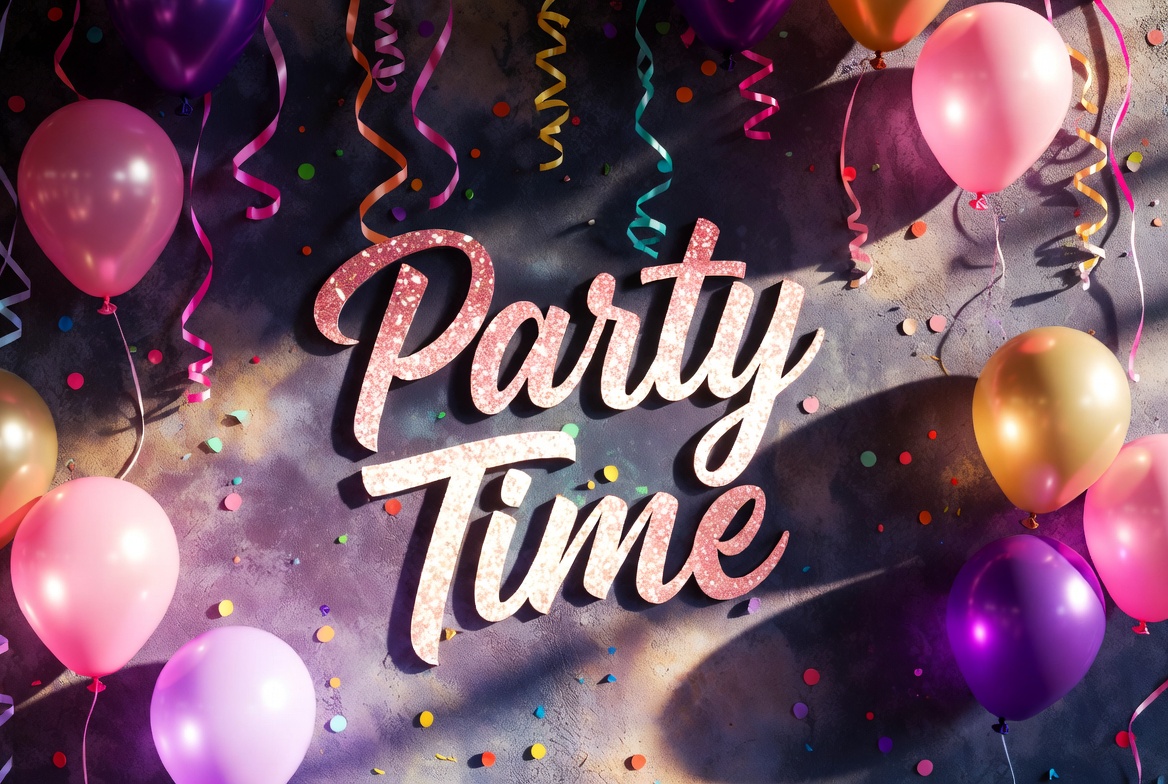 A sparkling glitter sign reading 'Party Time' hangs against a textured dark background. Colorful balloons in pink, purple, and gold float around it, surrounded by dangling streamers and scattered confetti. The festive elements create a vibrant celebration scene.