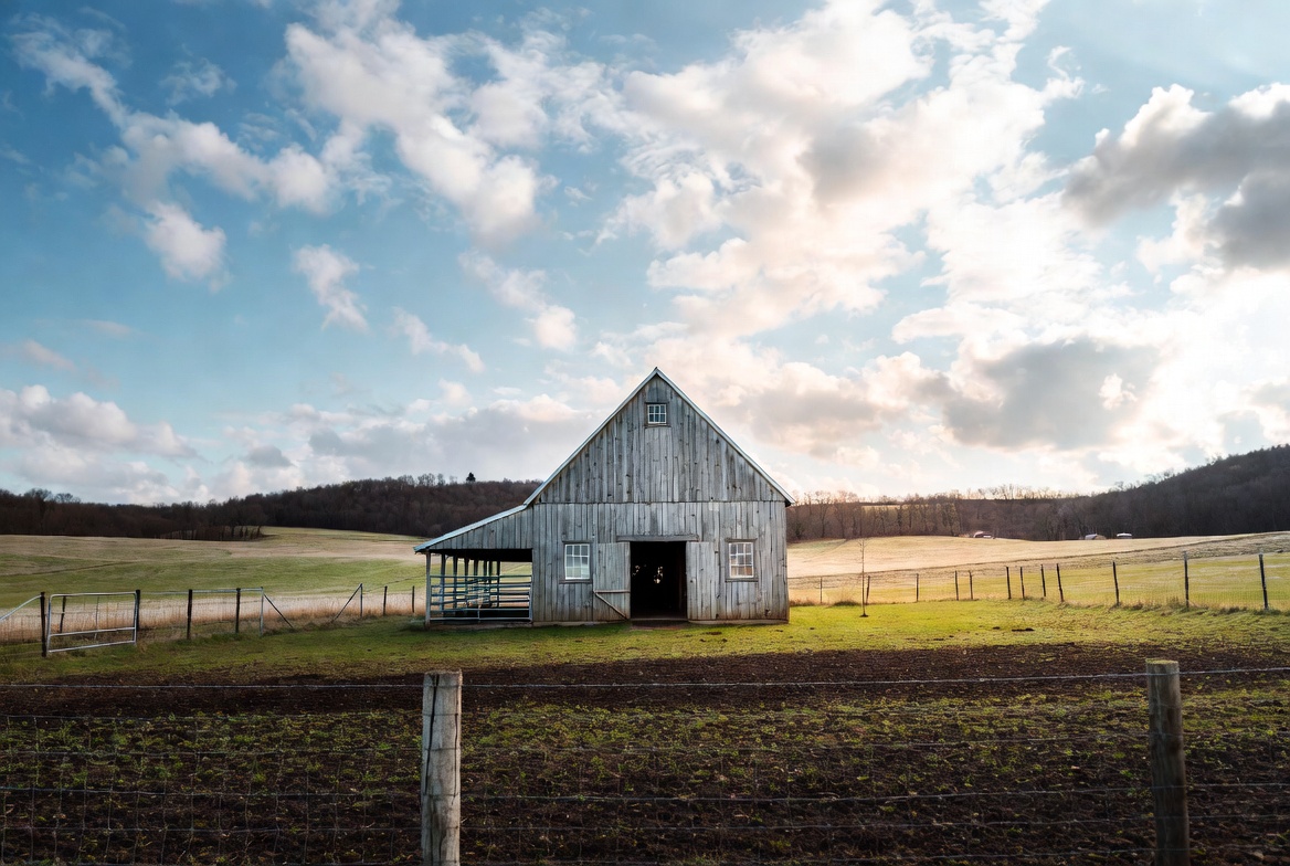 agriculture, clouds, countryside, daylight, farm building, farmland, fence, field, gabled roof, grass, hills, horizon, landscape, nature, outdoors, pasture, porch, rural, rustic barn, scenery, sky, sunlight, weathered wood, wooden barn, barn