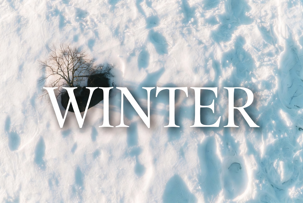 The word 'WINTER' is prominently displayed in large white capital letters on a snowy landscape. Snow-covered ground features scattered footprints and a small bare tree branch. The scene has a soft, blurred focus emphasizing the cold winter theme.