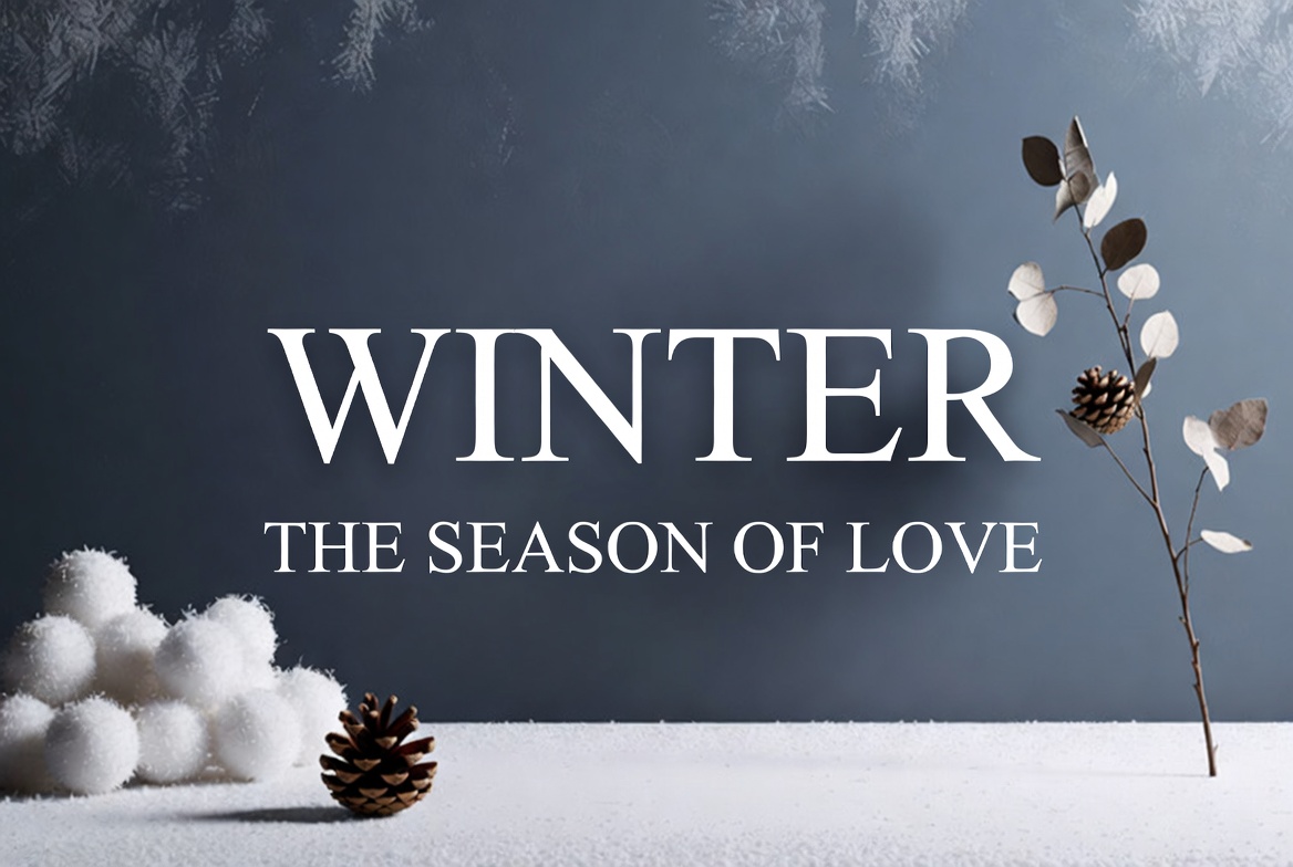 A graphic design features the bold white text 'WINTER THE SEASON OF LOVE' on a snowy blue background. Decorative elements include pine cones, fluffy white pom poms, and branches with dried leaves. Snowflakes hang from the top, creating a festive winter atmosphere.
