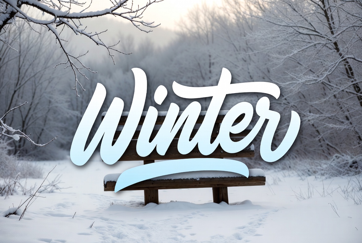 bare trees, cold weather, forest, frozen landscape, graphic design, nature, outdoors, script font, seasonal, snow, snow-covered, snowy bench, text, white text, winter landscape, wintry scene, wooden bench, winter