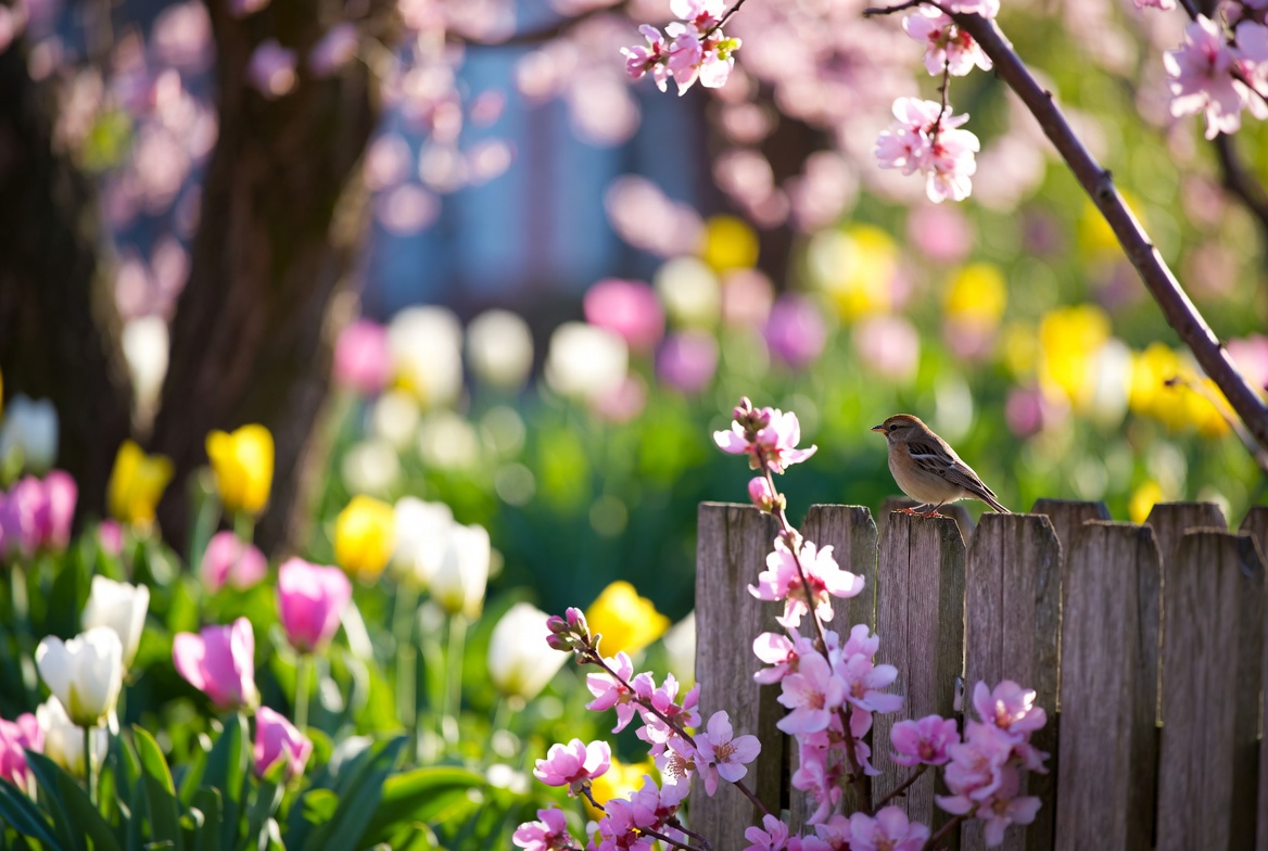 blooming trees, blossoms, cherry blossoms, cherry tree, fauna, flora, flower bed, flowers, garden fence, garden scene, nature, outdoor, petals, pink flowers, sparrow, spring garden, tulips, vibrant colors, white tulips, wildlife, wooden fence, yellow tulips, bird