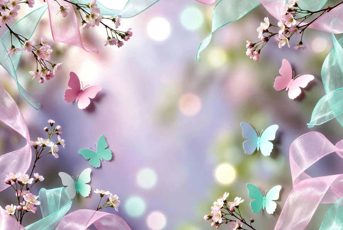 A dreamy background features clusters of pink cherry blossoms and sheer ribbons in pink and teal. Multiple butterflies in pink and green flutter among the branches and fabric. Soft bokeh lights create a blurred, ethereal purple backdrop.