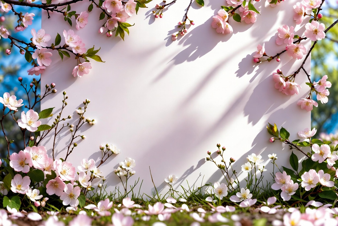 bloom, blossoms, blue sky, cherry blossoms, cherry tree, empty sign, floral frame, flower arrangement, flower bed, flowers, fresh flowers, garden, green leaves, greenery, isolated background, natural background, nature, outdoor, petals, pink flowers, sakura, shadows, sign frame, spring flowers, springtime, white board, white sign, blank sign