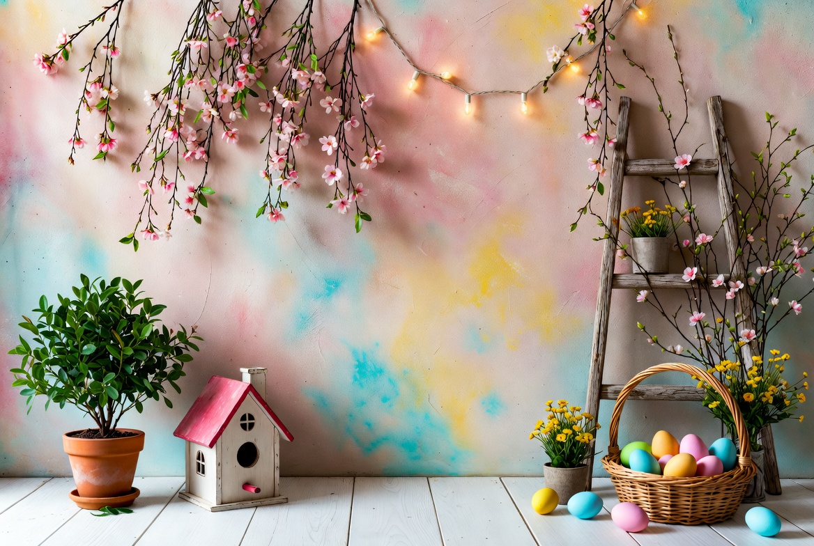 A colorful Easter scene features a small red-roofed birdhouse on a wooden floor surrounded by potted plants. A rustic wooden ladder leans against a pastel pink, blue, and yellow painted wall adorned with pink cherry blossoms and string lights. A woven basket overflows with yellow flowers and scattered colorful Easter eggs.