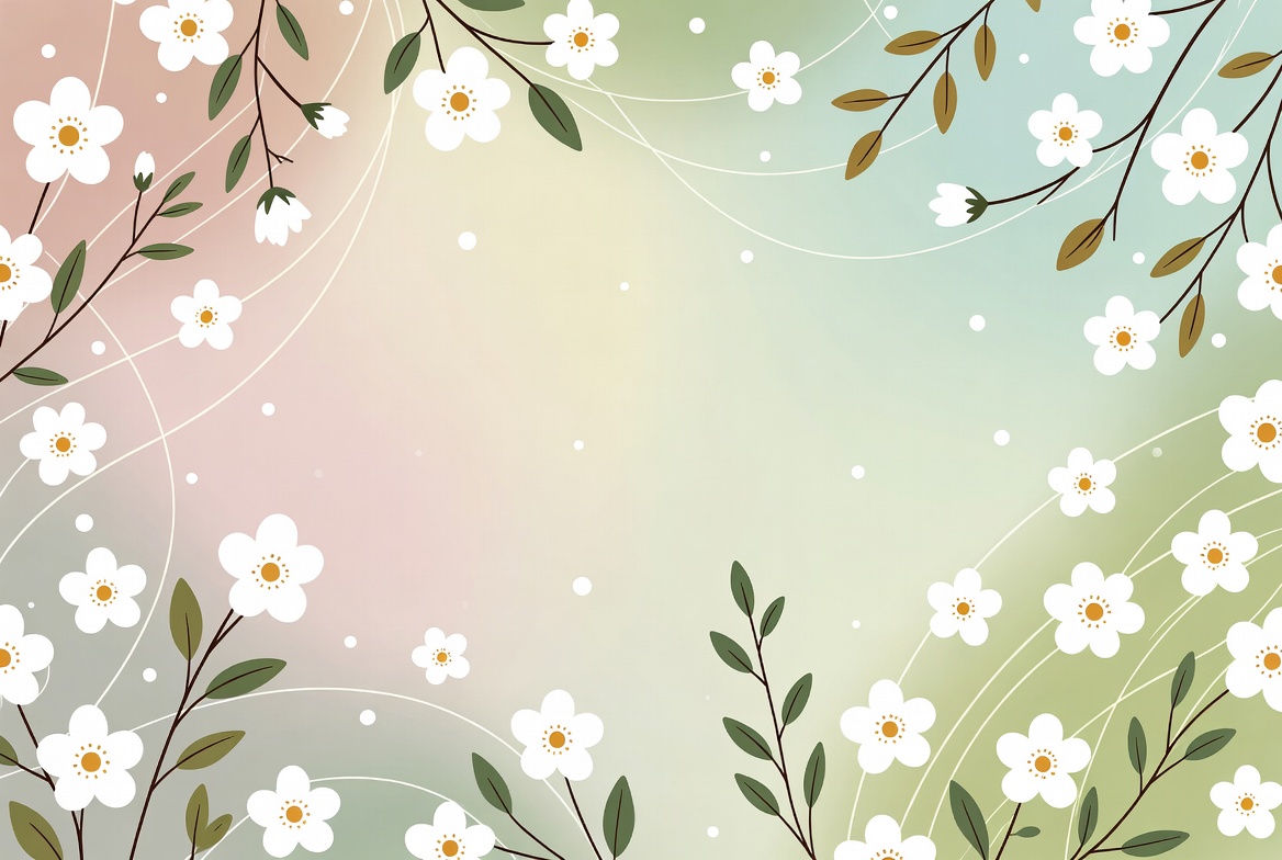 An illustration features clusters of delicate white flowers with green leaves arranged across a soft gradient background blending pink, green, and teal hues. The flowers and branches curve gracefully, creating a whimsical floral pattern. Subtle glowing effects enhance the ethereal design.