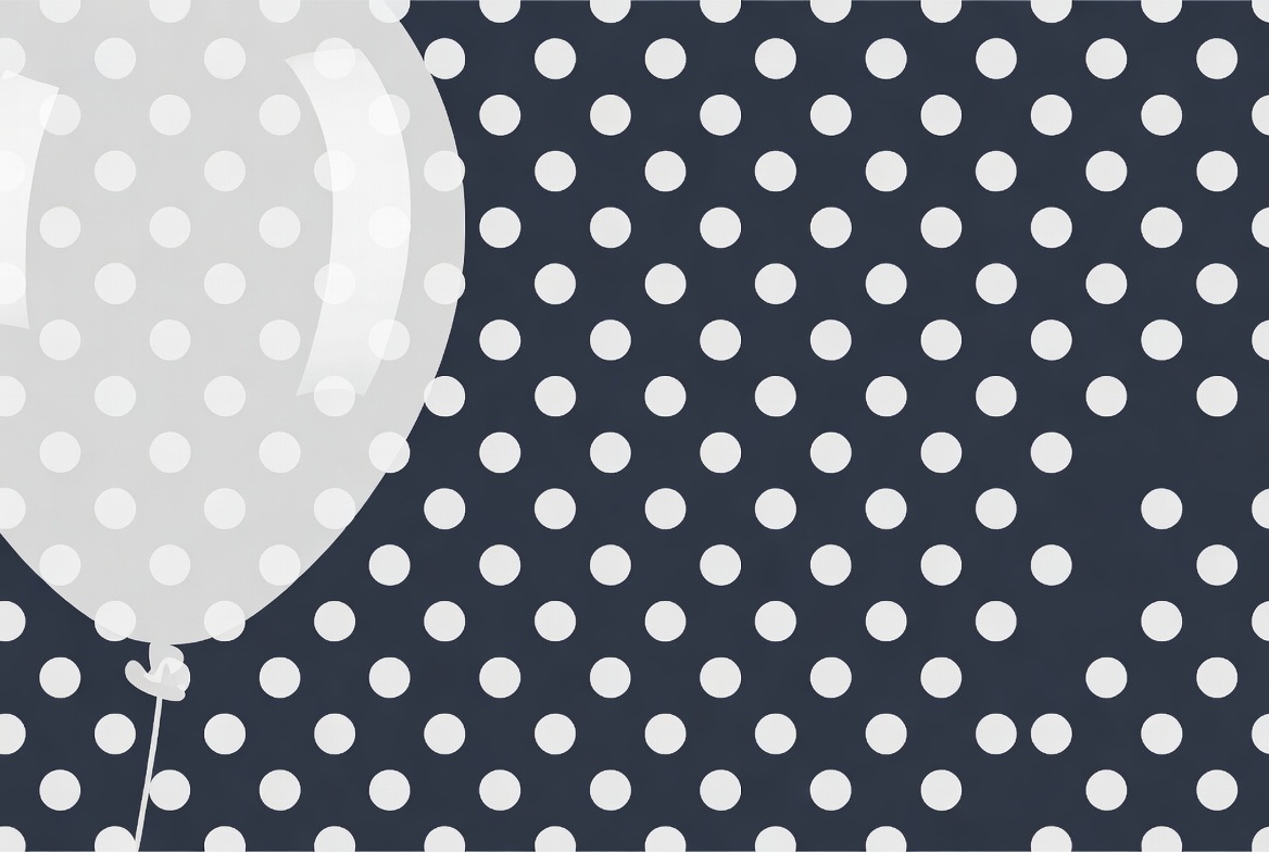 A white balloon with a string floats against a dark navy background covered in white polka dots. The balloon is illustrated in a simple, clipart style with a glossy shine. It is centered and isolated on the textured background.
