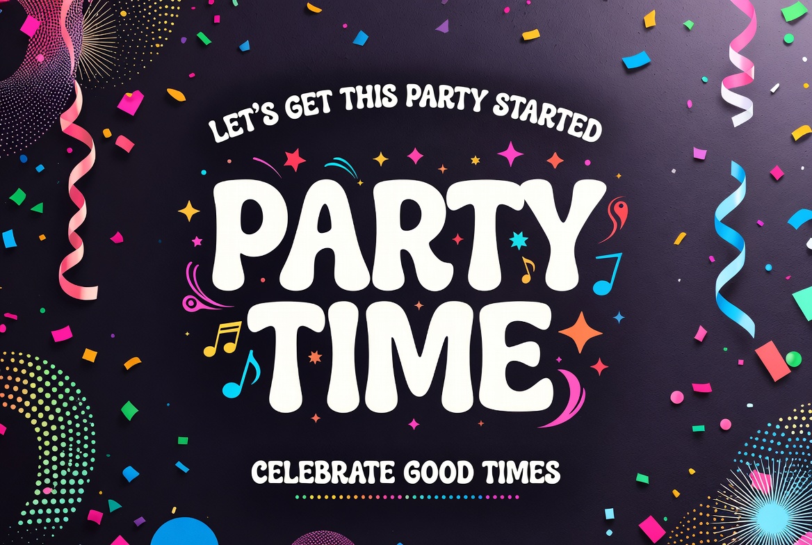 banner, celebration, clipart, colorful, confetti, festive, good times, illustration, invitation, isolated background, musical notes, party time, purple background, sparkles, started, streamers, text design, party graphic