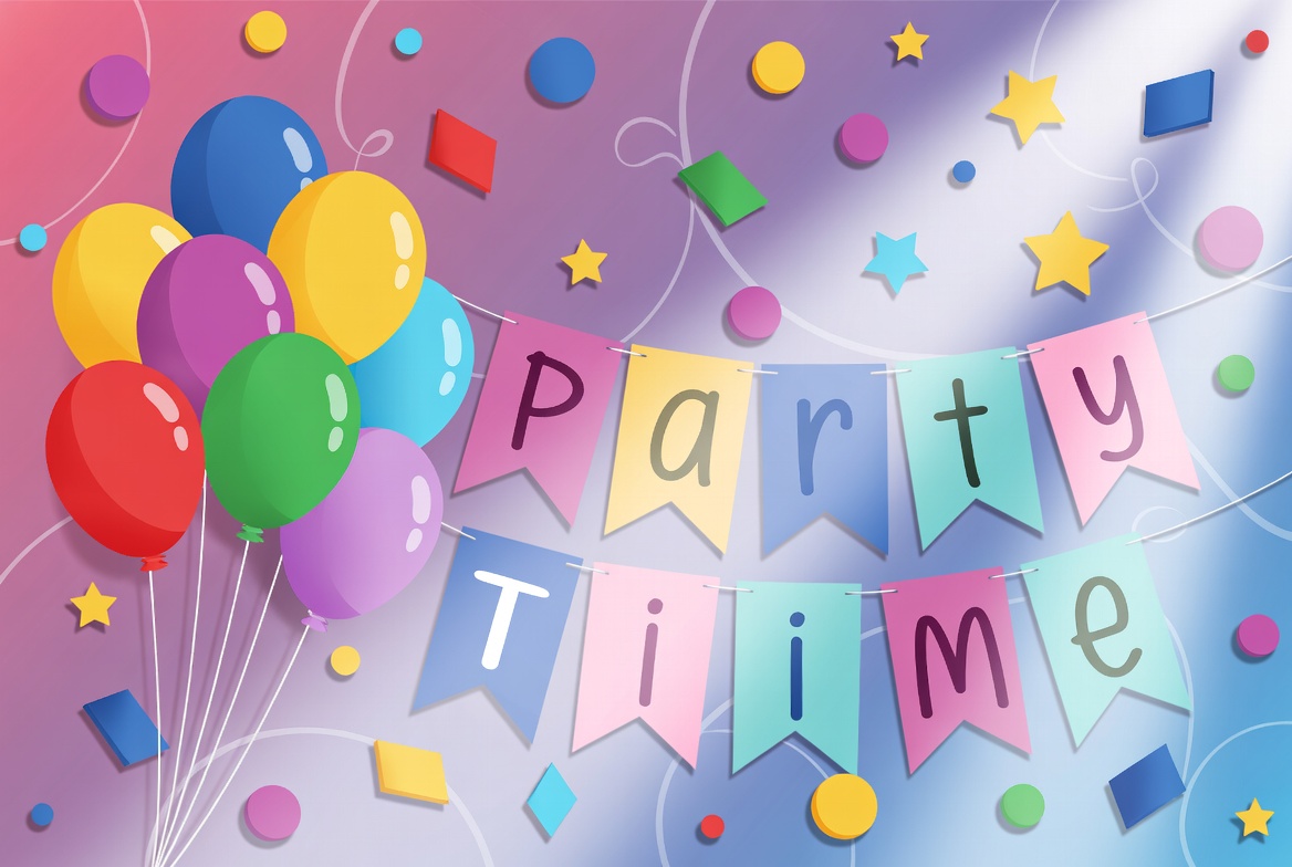 Colorful vector illustration features a pink and purple banner reading 'Party Time' with assorted balloons in red, yellow, green, blue, and purple. Scattered confetti, stars, and geometric shapes like circles, squares, and diamonds float around on a gradient background. The playful design is perfect for celebrations.