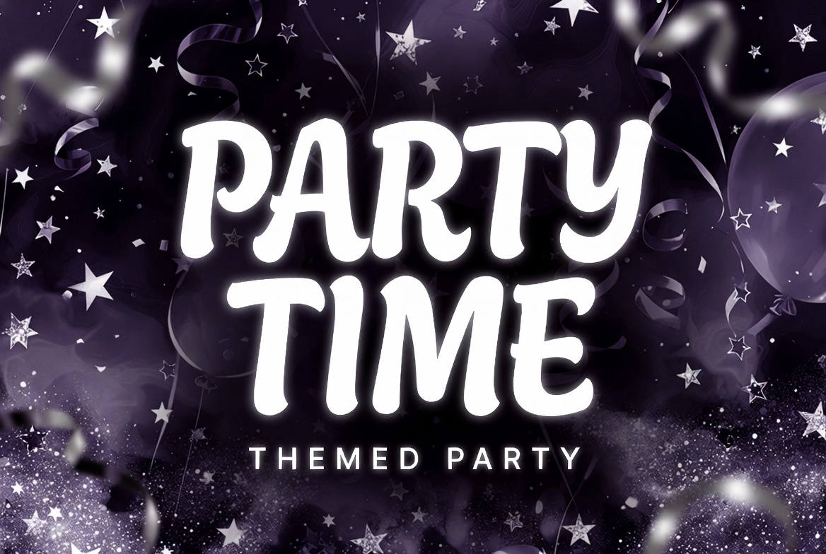 A vibrant graphic features the bold white text 'PARTY TIME' and 'Themed Party' on a purple starry background. Shiny balloons in purple and multicolored confetti ribbons float around the text. Sparkles and stars add a festive glow to the design.