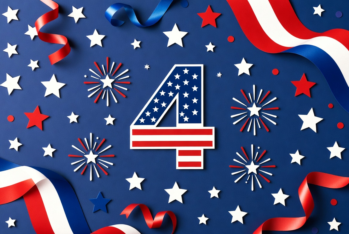A large white number four outlined in blue and red stands prominently on a navy blue background. Red and white stripes and blue ribbons curl around it, surrounded by white stars and red fireworks bursts. The design features bold American flag colors for a festive Independence Day theme.