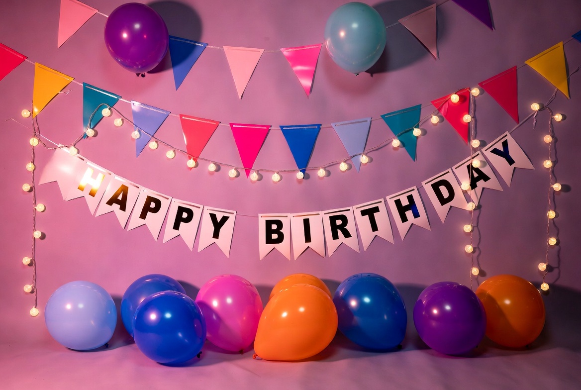 balloons, birthday banner, birthday party, birthday setup, blue balloons, celebration, event decor, festive backdrop, floor balloons, glowing lights, hanging banner, helium balloons, isolated background, multicolored balloons, orange balloons, party decorations, party flags, pink background, pink balloons, purple balloons, string lights, teal flags, triangular flags, vibrant colors, yellow flags, happy birthday