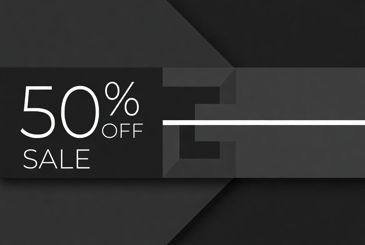 A bold black geometric badge features '50% OFF SALE' in large white text. The design includes angular shapes and a diagonal arrow-like form. It is isolated on a transparent background.