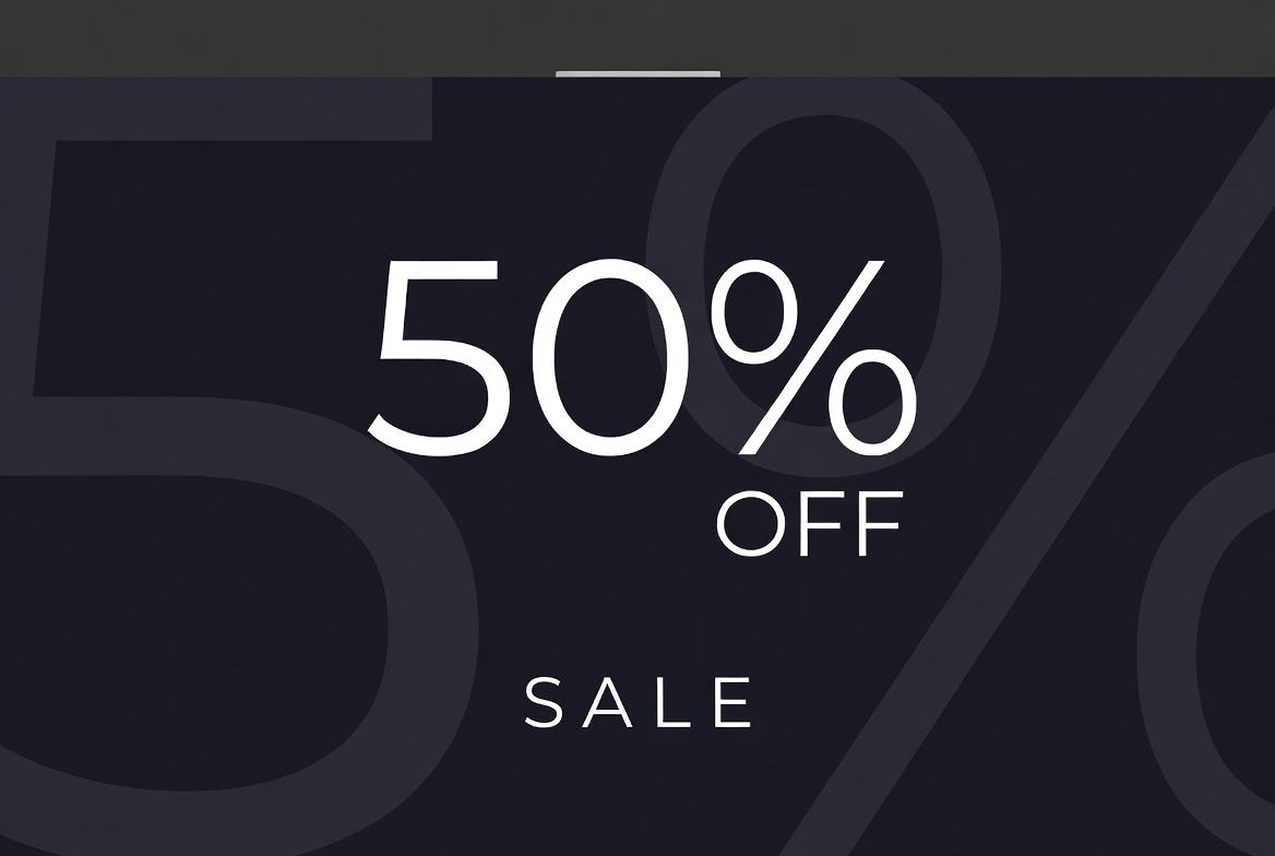 50% off, black background, bold text, deal, discount, graphic, isolated background, offer, percentage discount, promotion, retail, sale sign, shopping, white text, sale banner