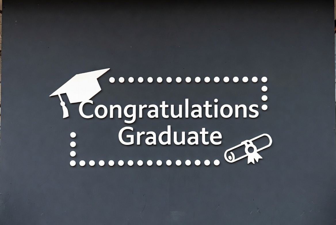A white 'Congratulations Graduate' sign features a mortarboard cap on the left and a diploma on the right. Dotted lines frame the text against a dark gray background. The design is simple and celebratory for graduation events.