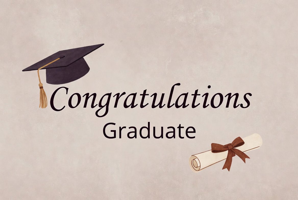 A clipart illustration features a black graduation cap with gold tassel and a rolled diploma with brown ribbon on a beige background. The text 'Congratulations Graduate' is written in elegant white font below the cap. The design is simple and celebratory for graduation themes.