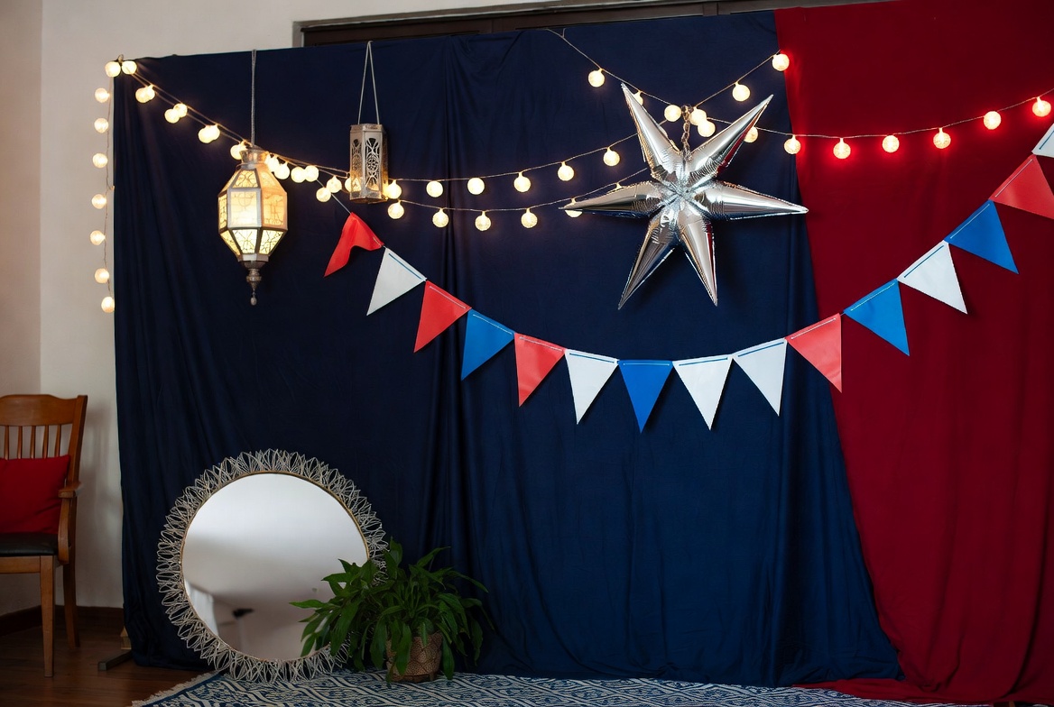American flag colors, Fourth of July, Independence Day, blue bunting, event decoration, fairy lights, festive decor, hanging lanterns, isolated background, navy blue curtain, party setup, photo booth, potted plant, red bunting, red curtain, red cushion, round mirror, silver star, triangular bunting, white bunting, wooden chair, patriotic backdrop