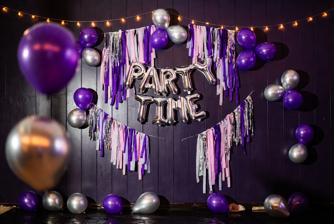 balloons, celebration, dark wall, fairy lights, festive, foil letters, isolated background, party backdrop, party decor, pink streamers, purple, purple balloons, silver, silver balloons, tassel streamers, wooden background, party time