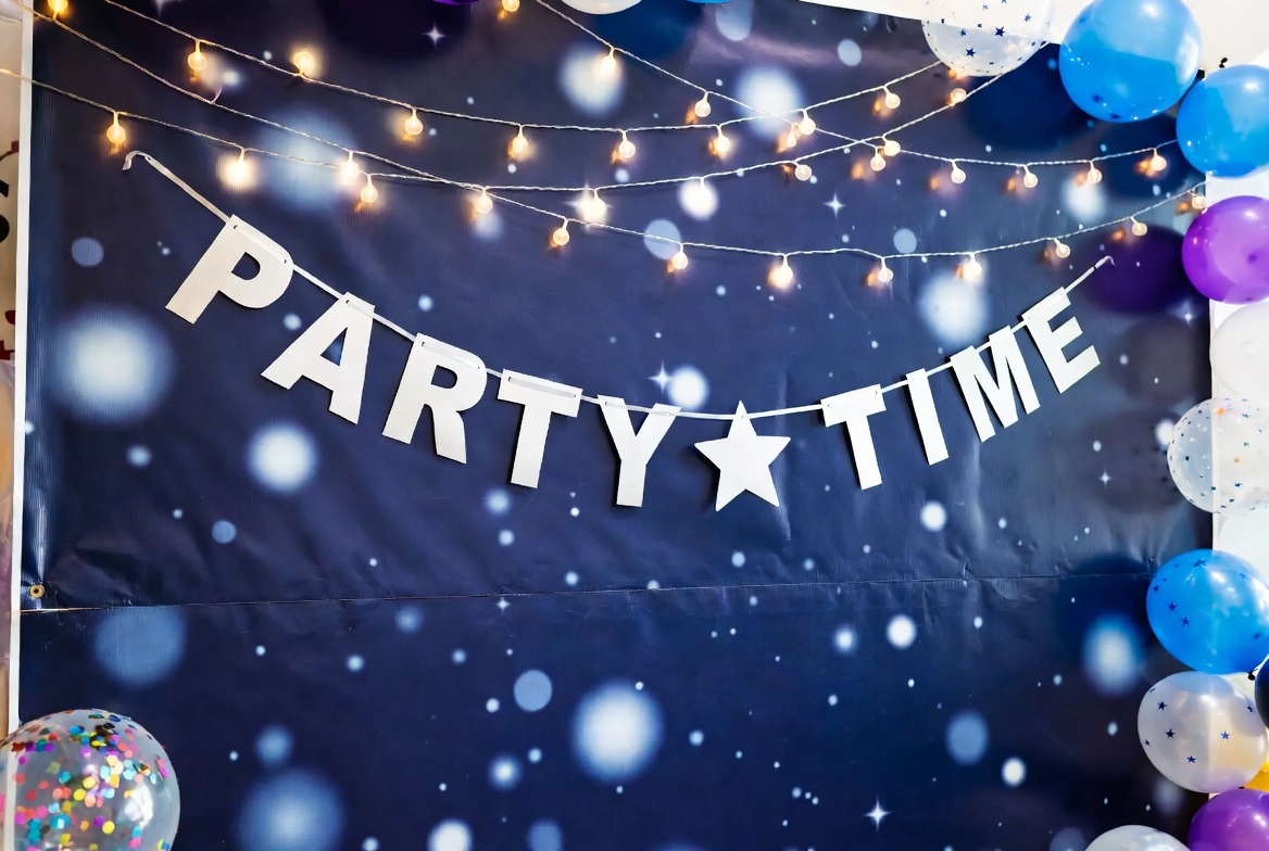 A white 'PARTY TIME' banner with star accents hangs against a dark starry background with bokeh lights. Colorful balloons in blue, purple, and white cluster around the edges. Twinkling string lights drape above the festive setup.