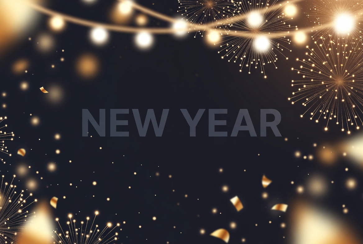 A festive digital illustration features golden fireworks exploding against a dark background. Strings of glowing lights drape across the top, with sparkling confetti scattered throughout. Bold 'NEW YEAR' text is centered in white.