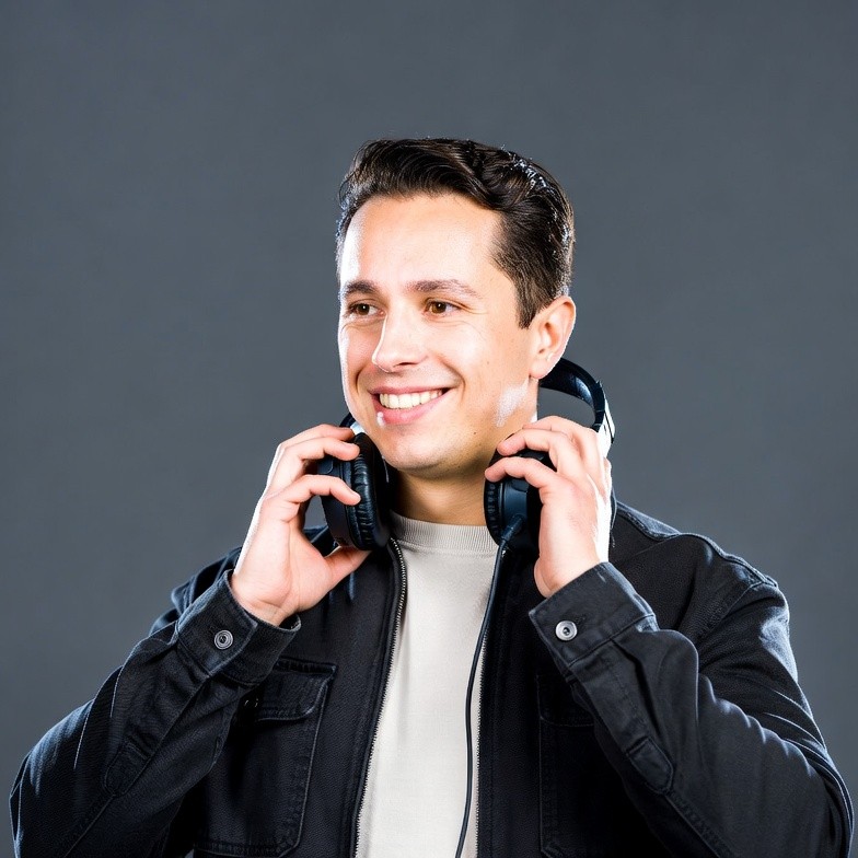 A young Latino man with short dark hair smiles while holding black over-ear headphones around his neck. He wears a white t-shirt under a dark denim jacket and stands against a plain gray background. His expression is happy and relaxed.