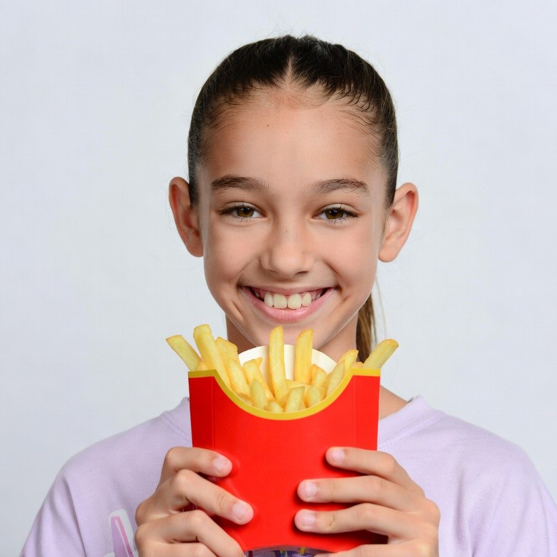 McDonald's, brown hair, child, fast food, food, french fries, fries box, golden fries, happy girl, holding food, isolated background, ponytail, purple shirt, red container, smiling, snack, white background, young girl, girl