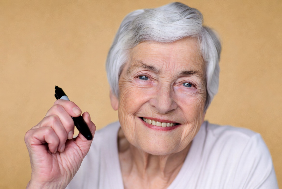 An elderly woman with short silver hair smiles warmly while holding a black marker in her raised hand. She wears a light-colored top and stands against a plain yellow background. Her blue eyes are bright and she has a friendly expression.